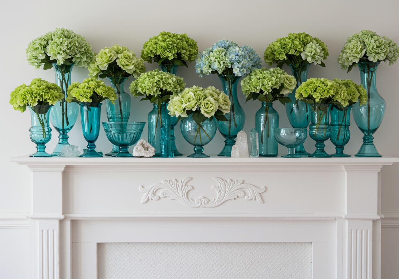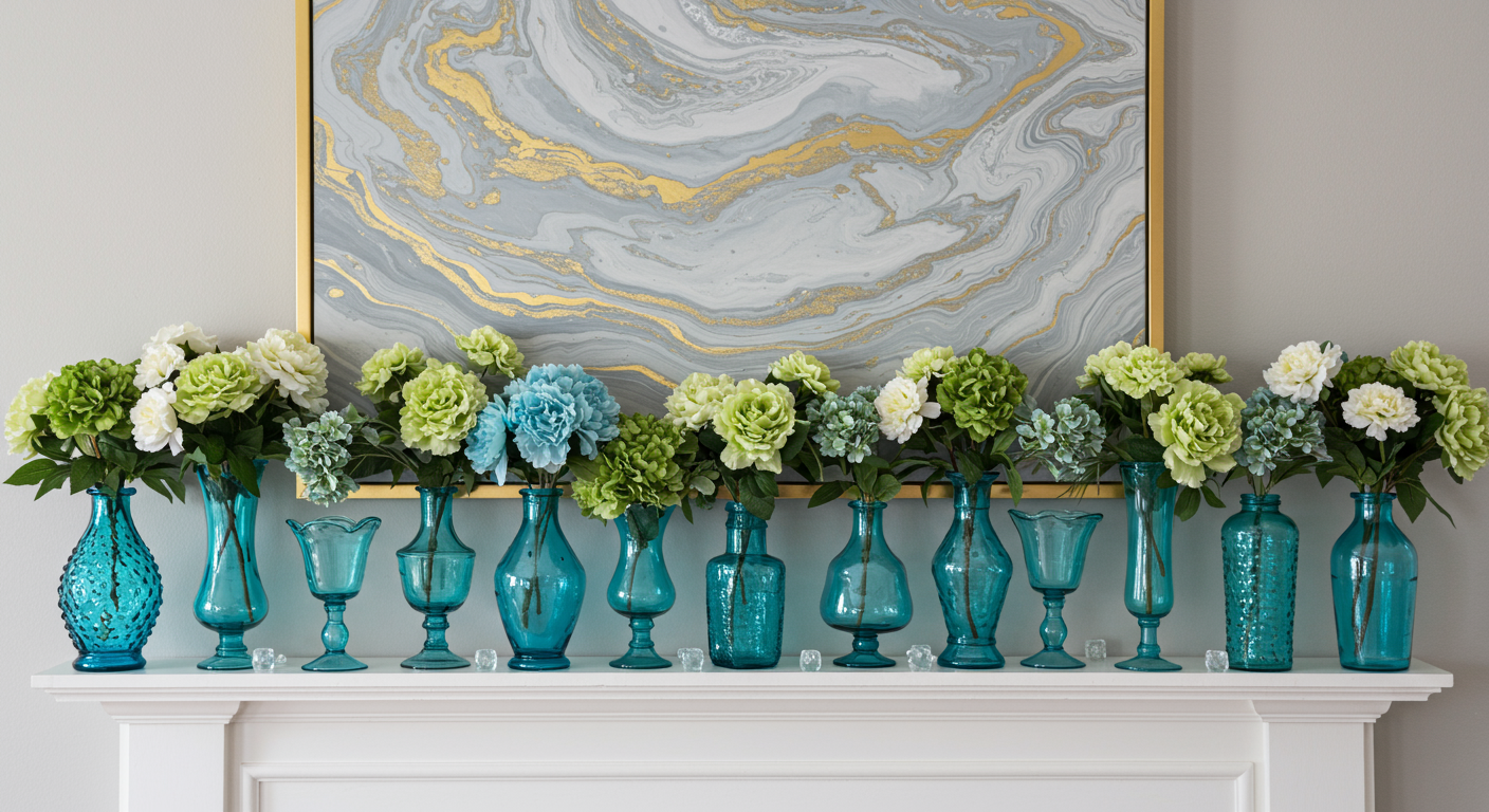 Collages on walls are trending as we move away from a sparse look to a more, can I say cluttered? look. Judith Bright’s showroom hits it perfectly with their display of fresh and fun flower jars. Great look!