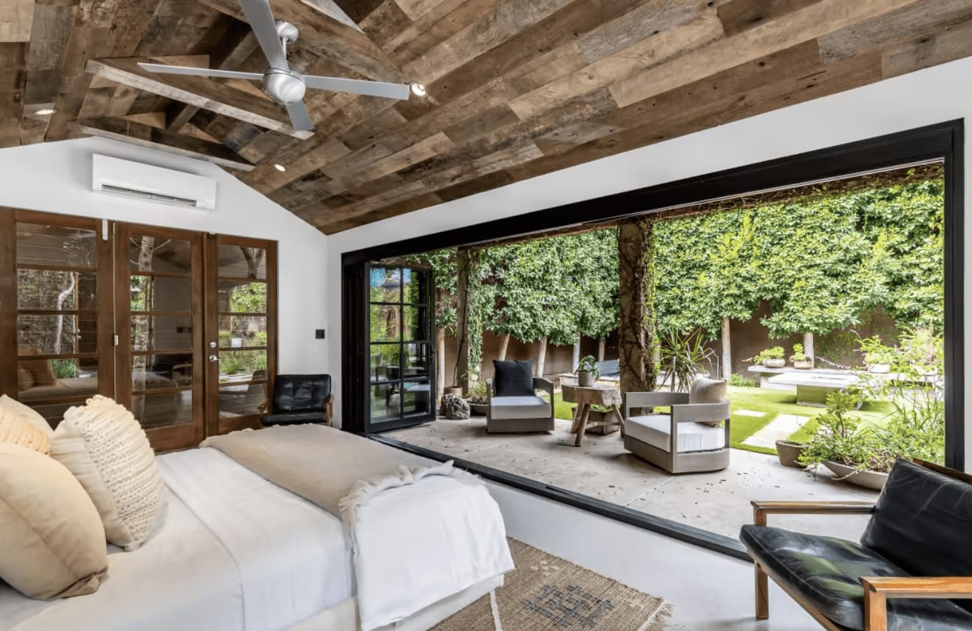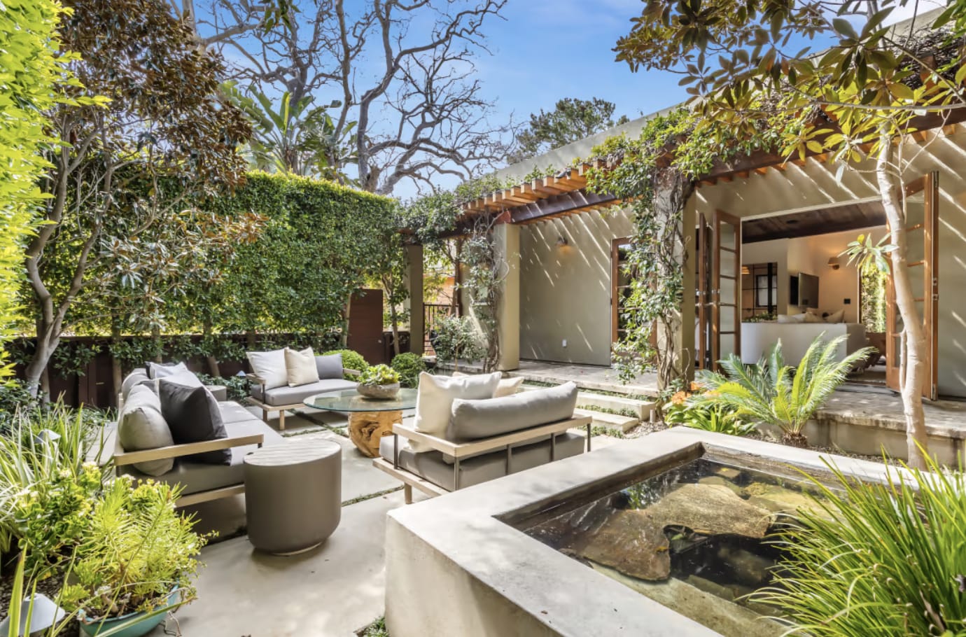 The next property I wanted to show was once owned by A-list actor Bradley Cooper, it showcases the enchanting blend of indoor and outdoor living. Located in the Los Angeles neighborhood of Venice, it was featured in Mansion Global. It was listed this past April for 2.4 million. With its lush landscaping and vines growing on pergolas, the exterior seamlessly blends with the interior, creating a unique and harmonious setting. Inside, reclaimed-wood ceilings and concrete floors add a touch of natural elements, while French doors open up to flood the space with natural light.