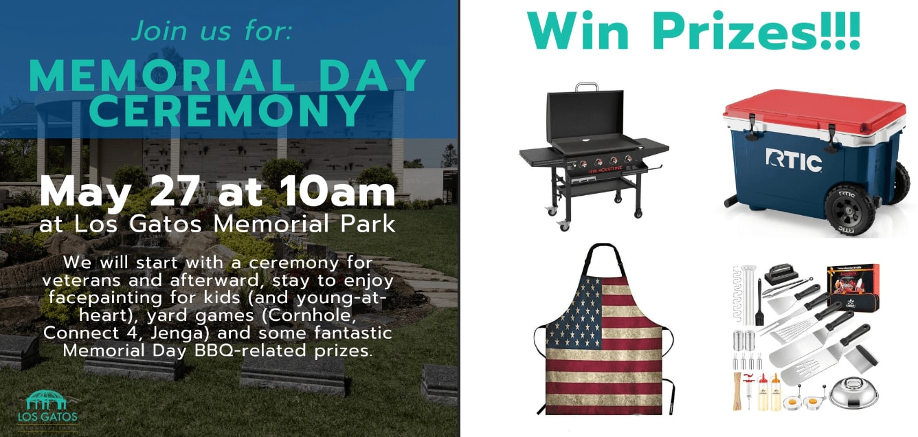 Memorial Day at Los Gatos Memorial Park: Los Gatos Memorial Park is hosting a special Memorial Day ceremony. The San Jose Metropolitan Band begins playing at 10 am, and there will be complimentary donuts and coffee. At 11 am, a ceremony for veterans will take place, followed by family-friendly activities including face painting, yard games (Cornhole, Connect 4, Jenga), and fantastic Memorial Day BBQ-related prizes.